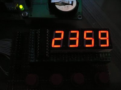 รูปต่อมาเป็น หน้าตาของนาฬิกา เป็นแบบ 4 หลักง่ายๆ ก่อน ส่วนที่ยาก คือการขับ 7-segment เมื่อไม่มีไอชีที่ทำหน้าที่เป็น buffer หมายถึงไม่มีการ hold data เราจะเขียนโปรแกรมให้มีการหยุดรอในโปรแกรม หรือมี delay() ไม่ได้เลย เพราะว่า เราต้องใช้ตัวของ arduino ทำหน้าที่เป็น multiplexer ด้วย