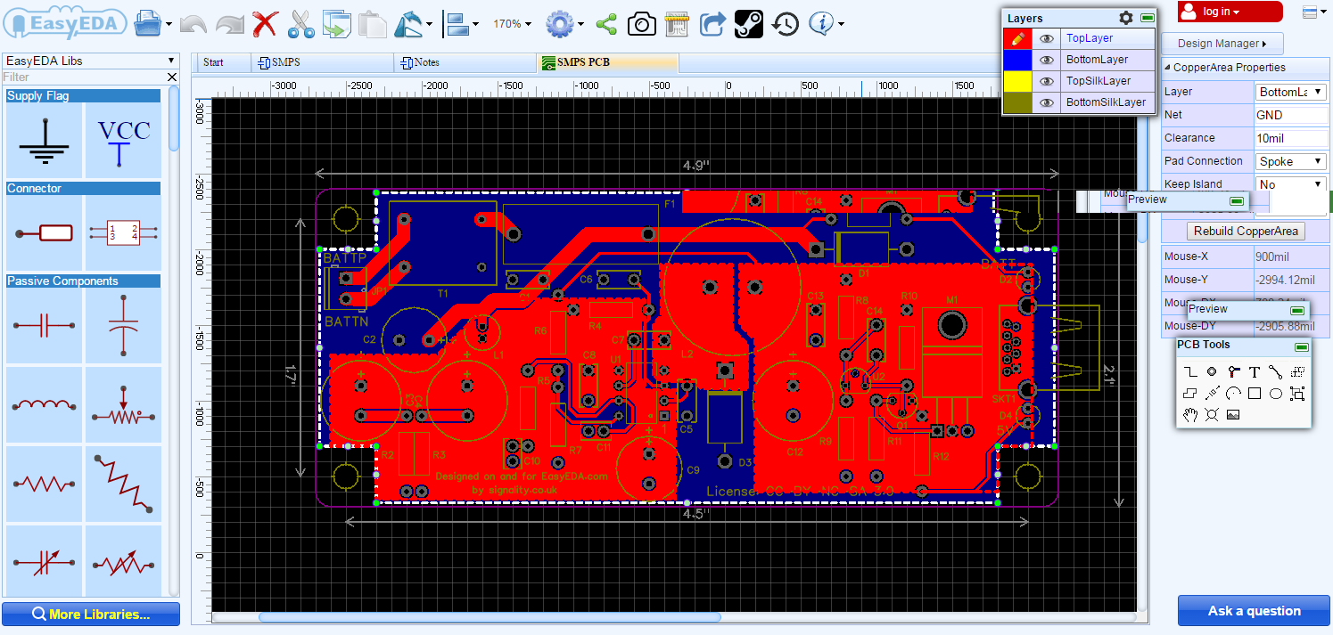 EasyEDA เป็นโปรแกรมเครื่องมือทางอิเล็กทรอนิกส์ที่มาครบมาก และ โปรแกรมรันอยู่บนเว็บเบราว์เซอร์ ทำงานได้ทุกที่ ที่ต่อคลาวด์ ต่อเน็ทได้ ไม่ต้องติดตั้งก่อน และ เราทำงานบนเครื่องคอมพิวเตอร์เครื่องไหนก็ได้ ผมมองมันเหมาะสำหรับวิศวกรไฟฟ้า อาจารย์ workshop ผู้สอน นักเรียน นักศึกษาวิศวกรรม และ ผู้ที่สนใจ มีงานอดิเรกอิเล็กทรอนิกส์ และ ที่สำคัญมัน ฟรี ครับ