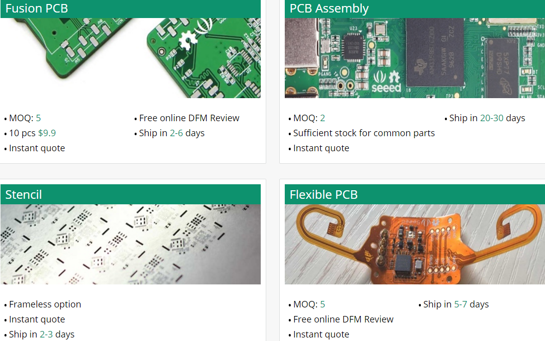 ทาง Seeed มีบริการผลิตโปรดักส์แบบครบวงจรอีกด้วย โดยทาง Seeed ออกแบบบริการให้สำหรับ เมกเกอร์ กับ นัก hobby ที่อยากจะผลิตต้นแบบ จำนวนน้อย 1-1000 ชิ้น แค่คุณเอาต้นแบบมา คุยกับทาง Seeed เขาจะใช้ทีมวิศวกรทางเขาช่วยออกแบบ และ ช่วยจัดหาชิ้นส่วน จาก supply chain management ในระบบเขา และใช้การผลิตแบบ agile ที่ช่วยความผิคพลาดในการผลิต ถ้าสนใจจะสั่งทำ PCB หรือ บริการอื่นๆ ไม่ว่าจะเป็น บริการประกอบแผงวงจร ทำ Stencil เข้าไปดูได้ที่ Fusion page